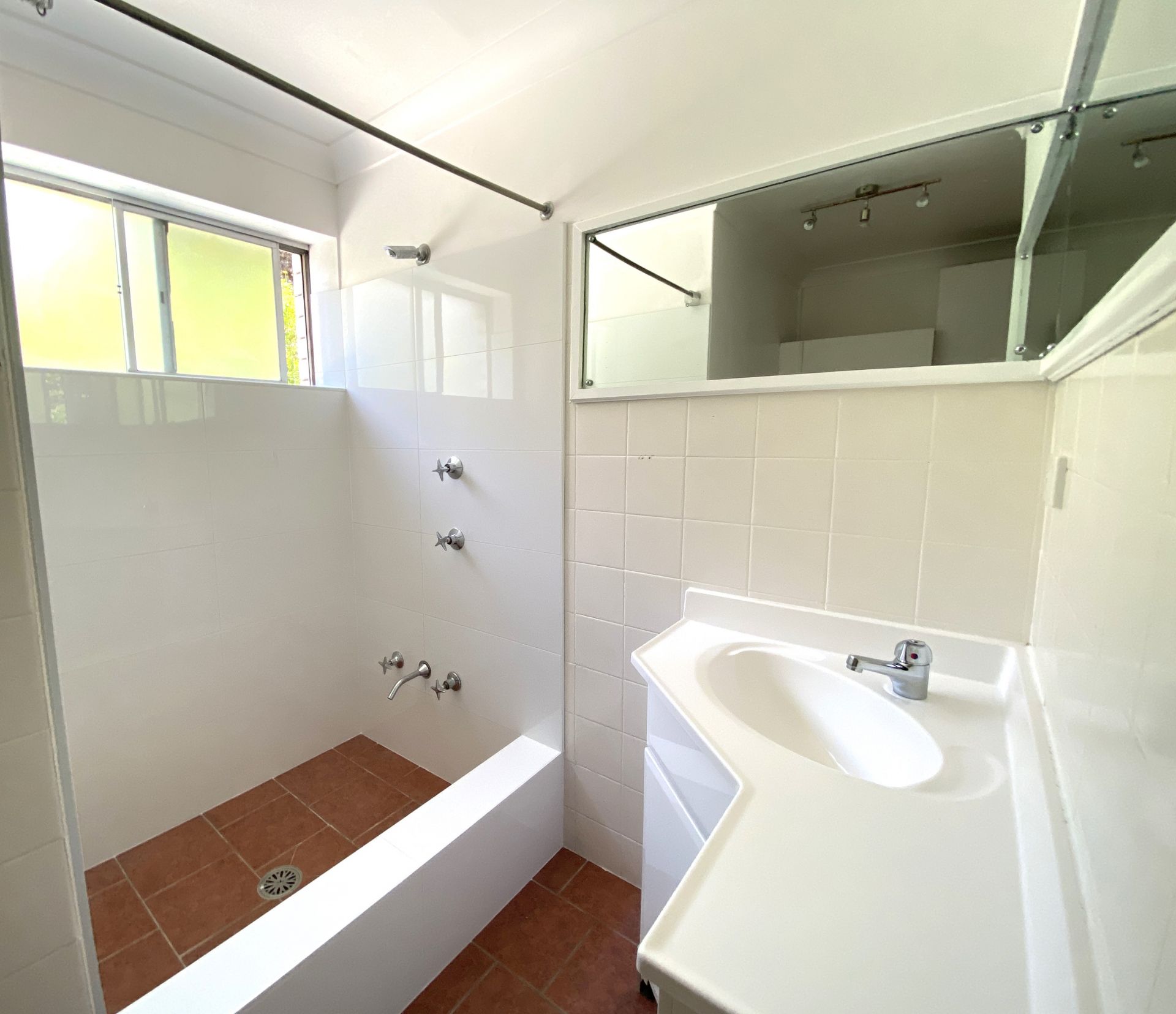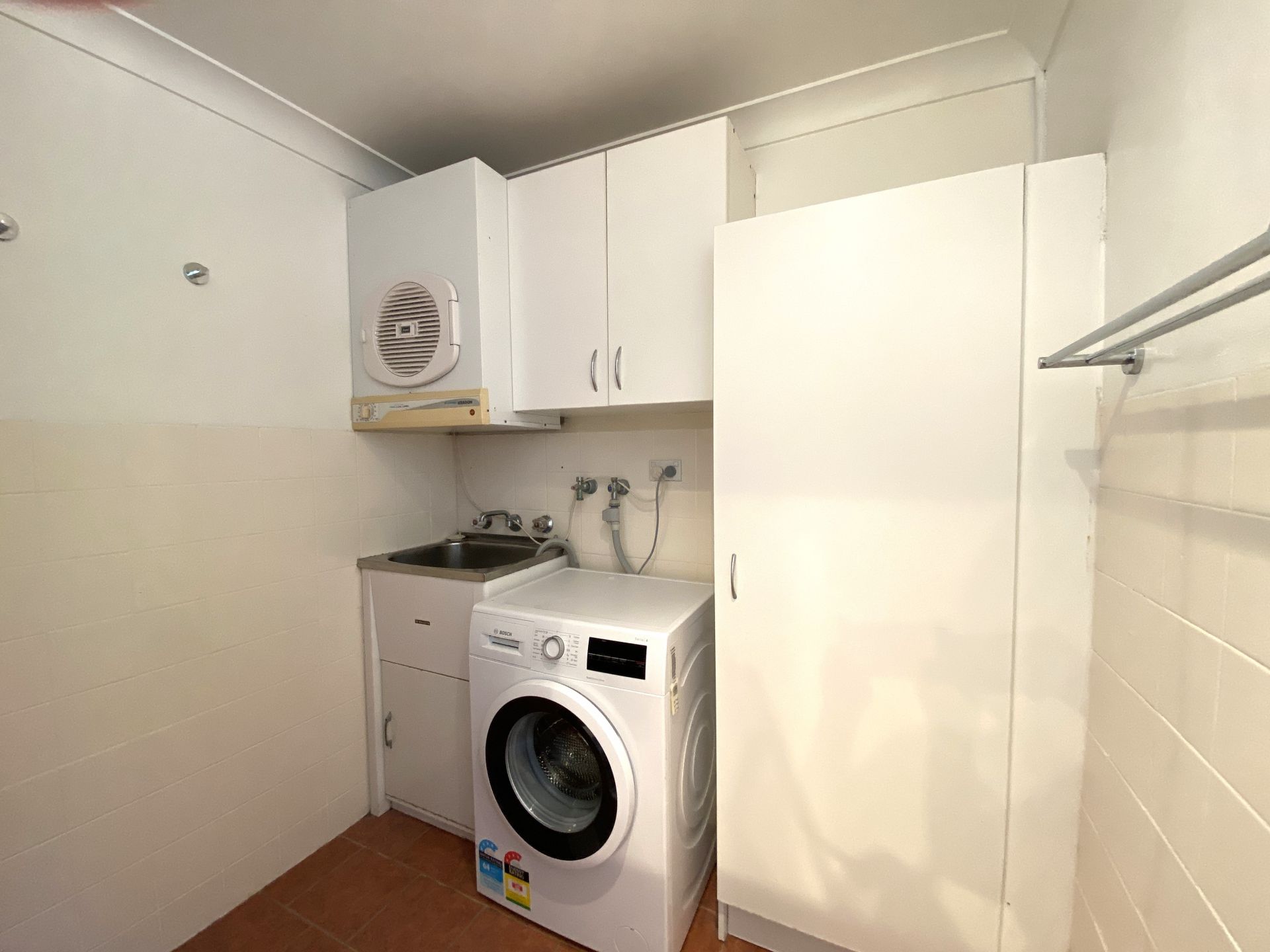 Renovated bathroom combined with internal laundry with storage cupboards.