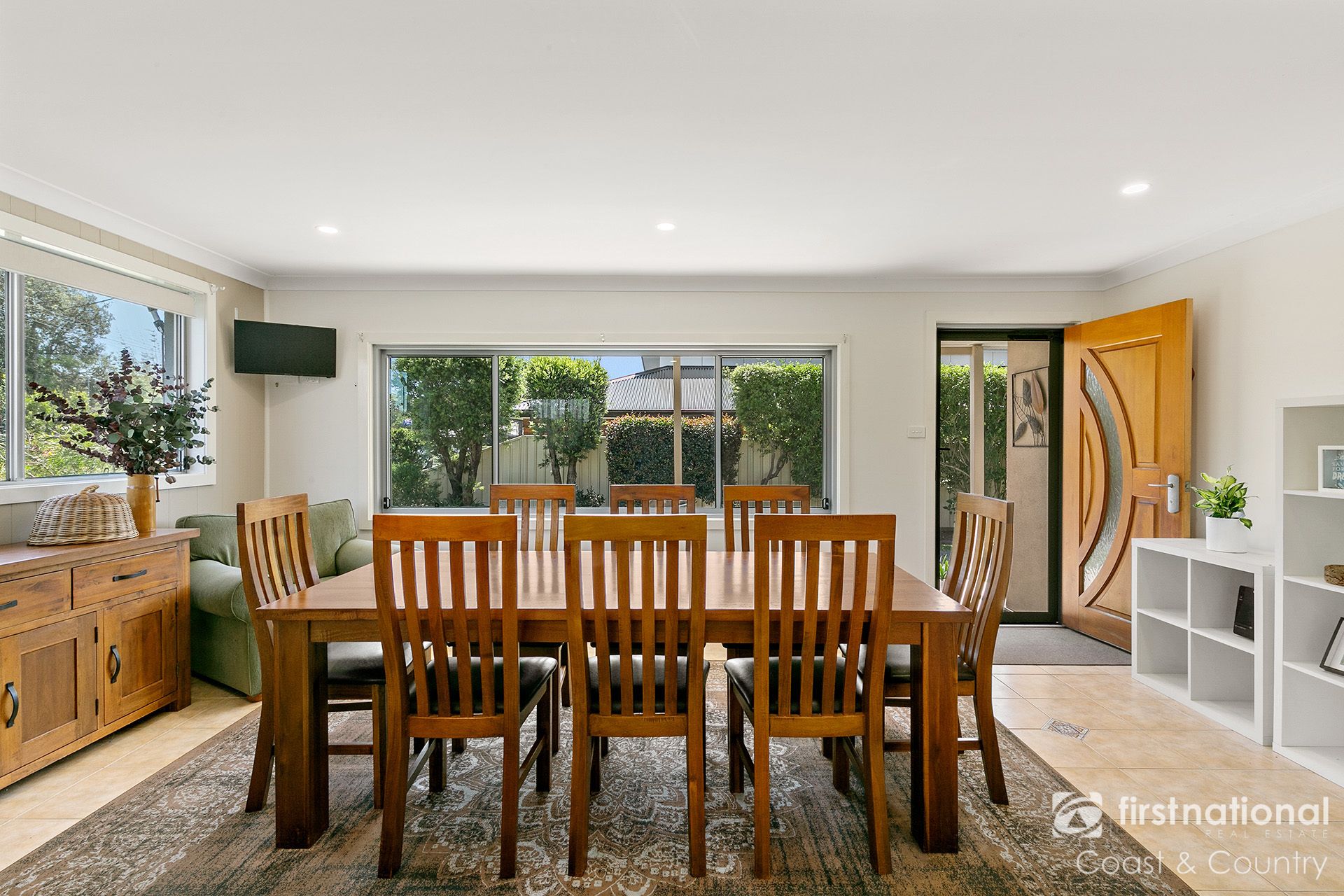 The open-plan living and dining areas are light-filled and spacious, creating a welcoming atmosphere perfect for relaxation and entertaining.