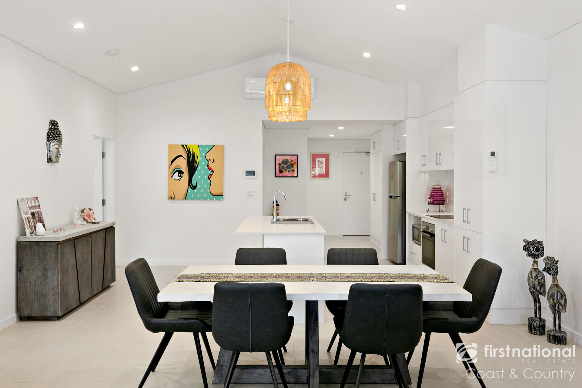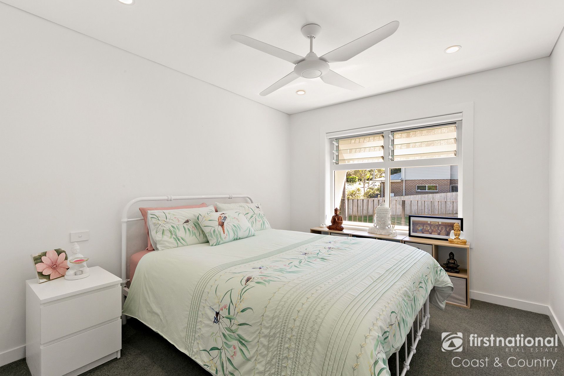 The modern kitchen is equipped with Caesarstone benchtops and quality appliances, combining practicality with style. Ceiling fans and air conditioning throughout ensure year-round comfort.