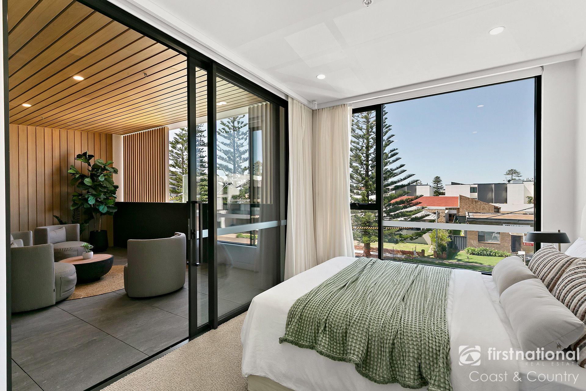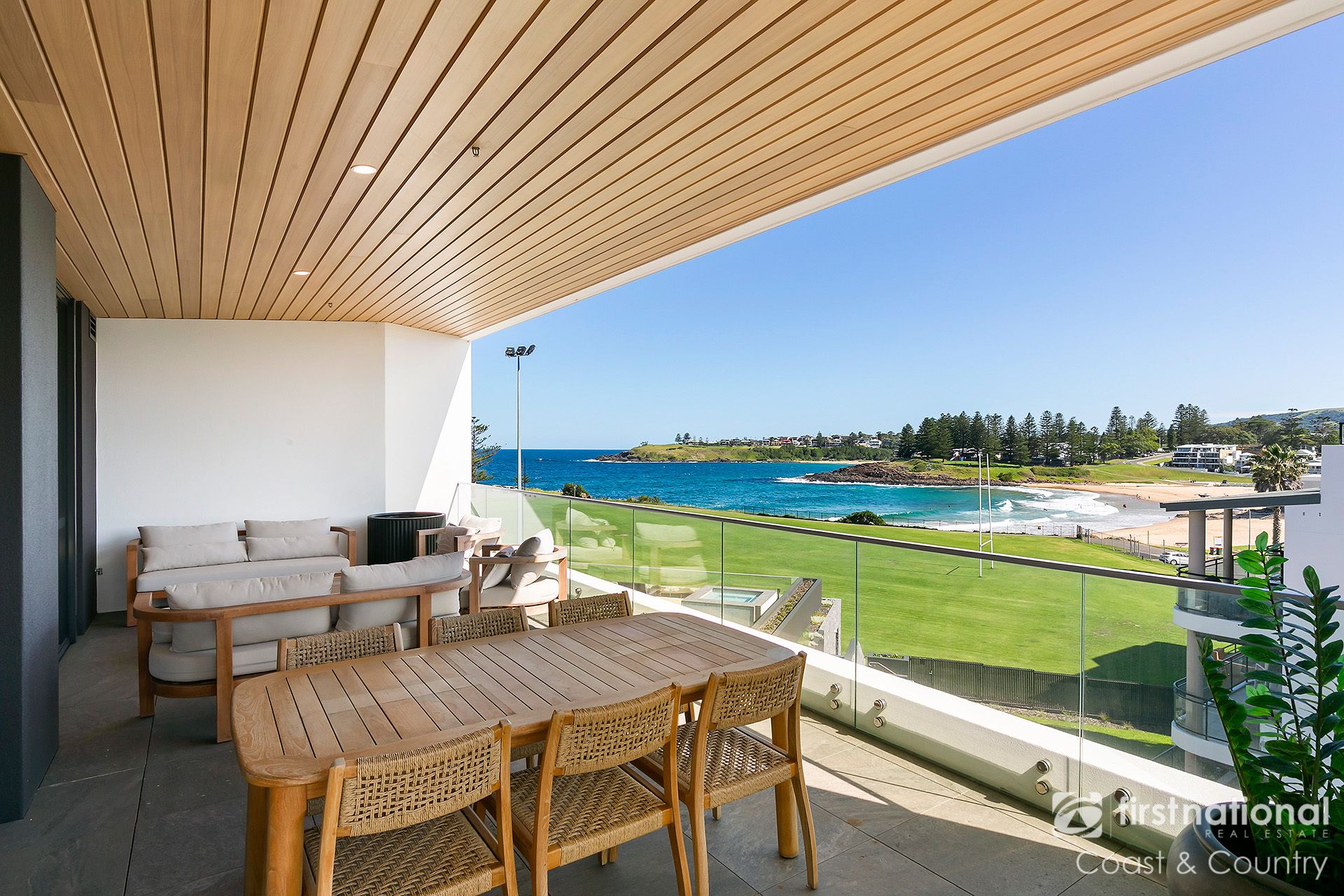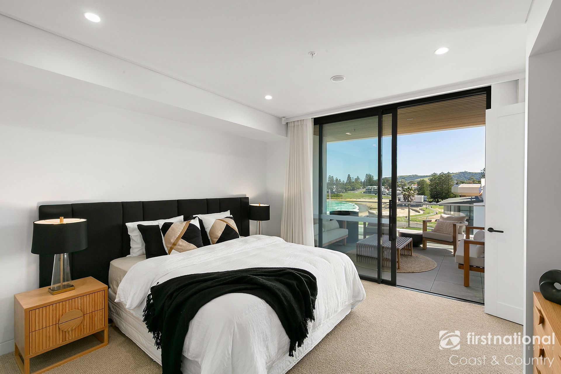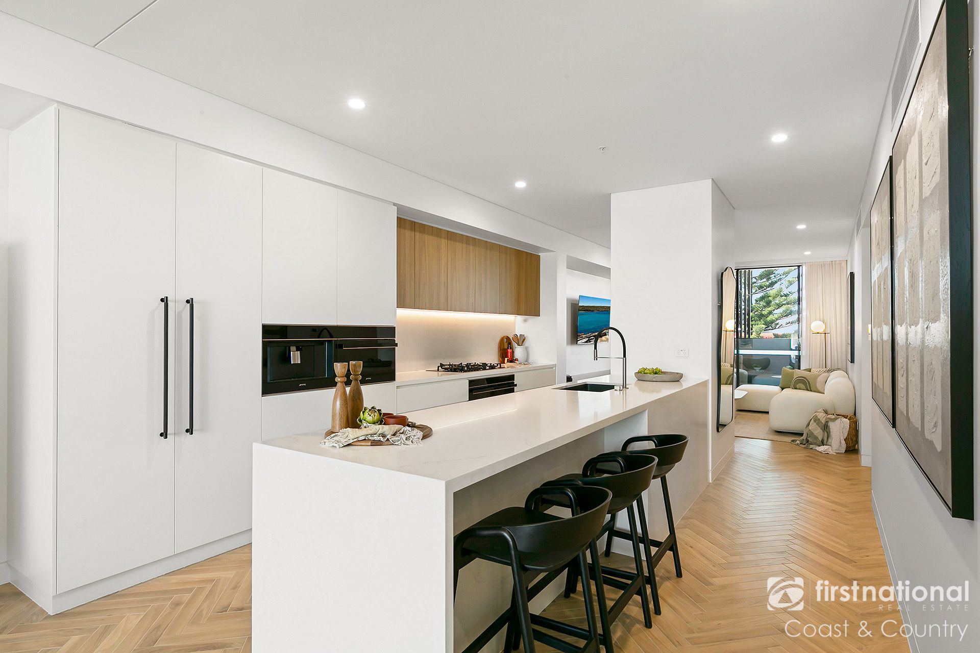 Interiors curated by local designers celebrate natural light, warmth and texture. Herringbone flooring, soft stone finishes and bespoke joinery anchor the living spaces, while full-height glazing opens to a generous terrace, a private retreat perfect for enjoying the beautiful views across Surf and Kendalls beach. The designer kitchen forms the heart of the home, featuring 40mm waterfall stone benches, a SMEG platinum appliance suite, integrated coffee system and wine fridge.