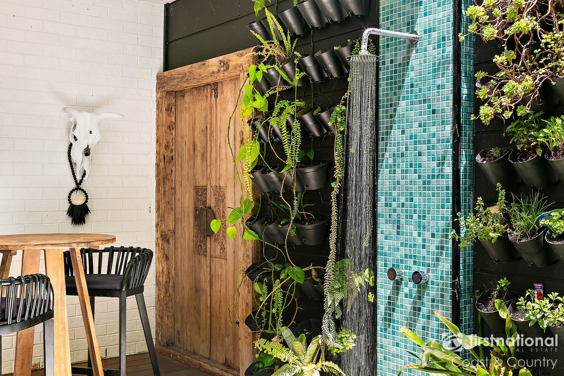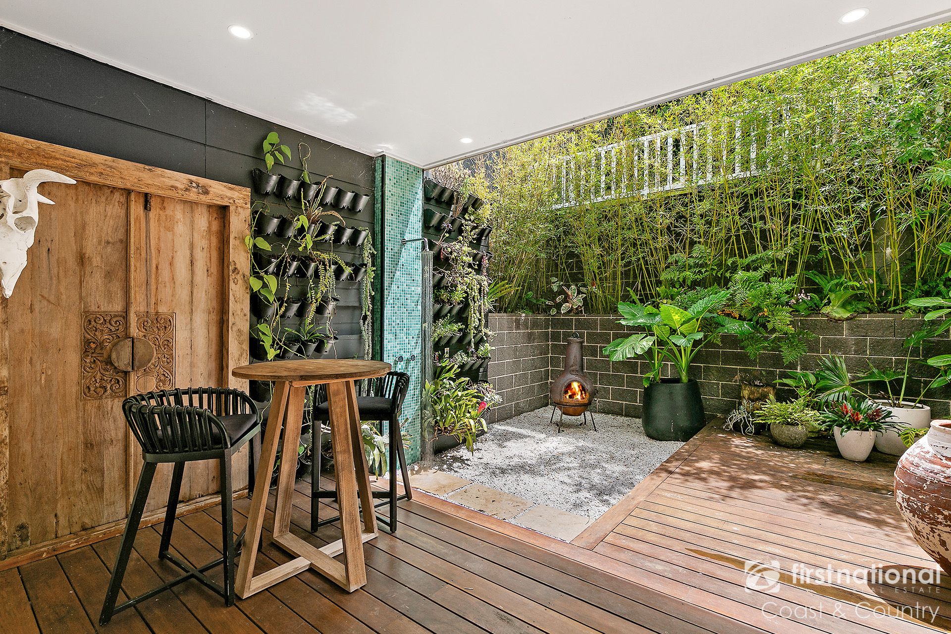Flowing directly from the living space are two stunning alfresco zones. To the front, a spacious covered balcony enjoys an elevated leafy outlook, the perfect setting for morning coffees, family meals, or relaxed evenings with friends as the sun sets over the hills. To the rear, a private decked courtyard framed by lush tropical gardens offers a tranquil escape, complete with an outdoor shower, ideal for those post beach rinse-offs. A renovated laundry with extra cabinetry and a separate toilet adds functionality on this level, enhancing the home's thoughtful layout.
